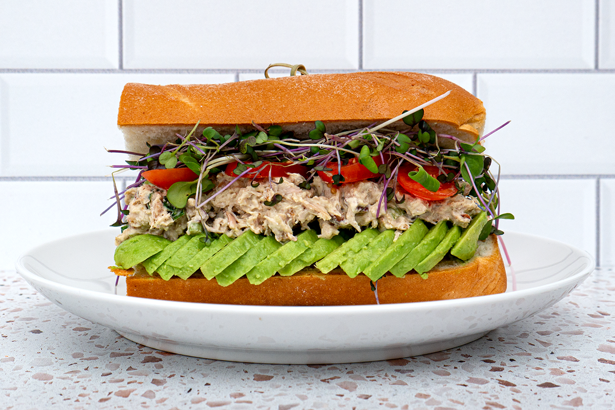 4. Garnish the sandwich with avocado, cherry tomatoes, and microgreens.
