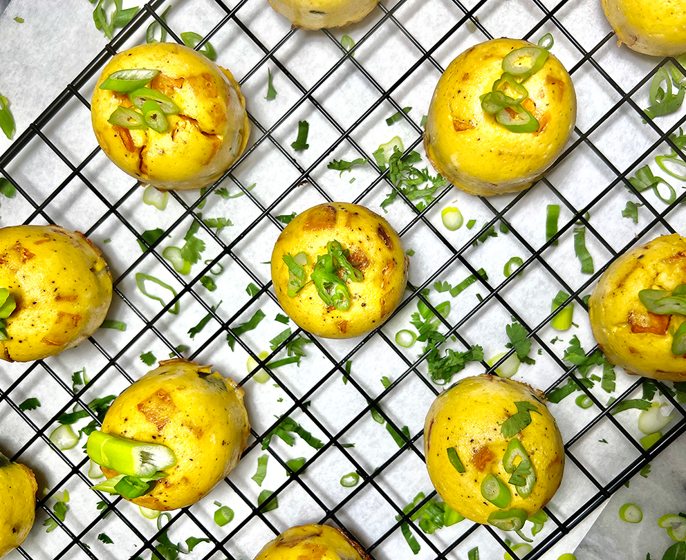 Remove the egg bites from the oven and let rest in the pan for about 5 minutes. Use a small spoon to loosen the egg bites from the edges of the pan and carefully lift them out onto a plate. Serve warm.