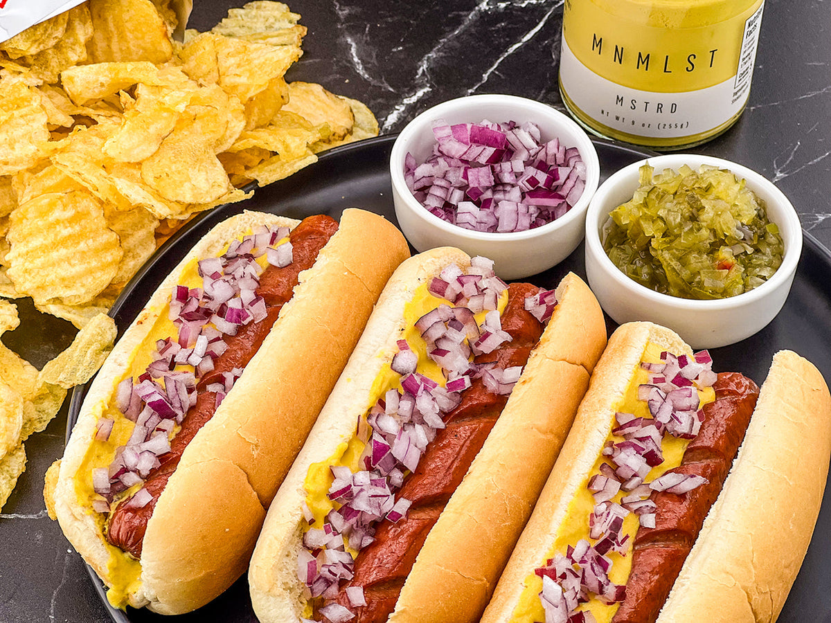 Add hot dog to the bun and top with mustard, relish, and onion.