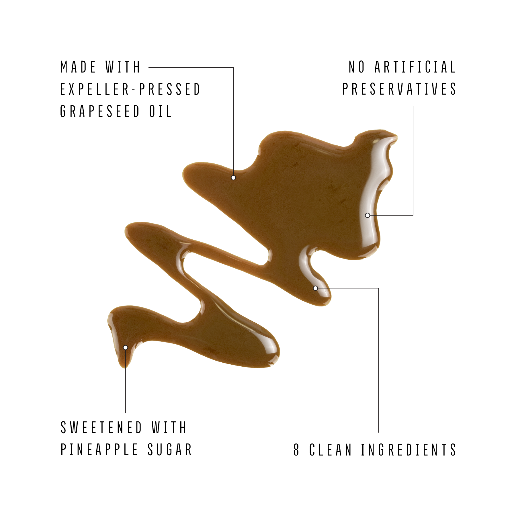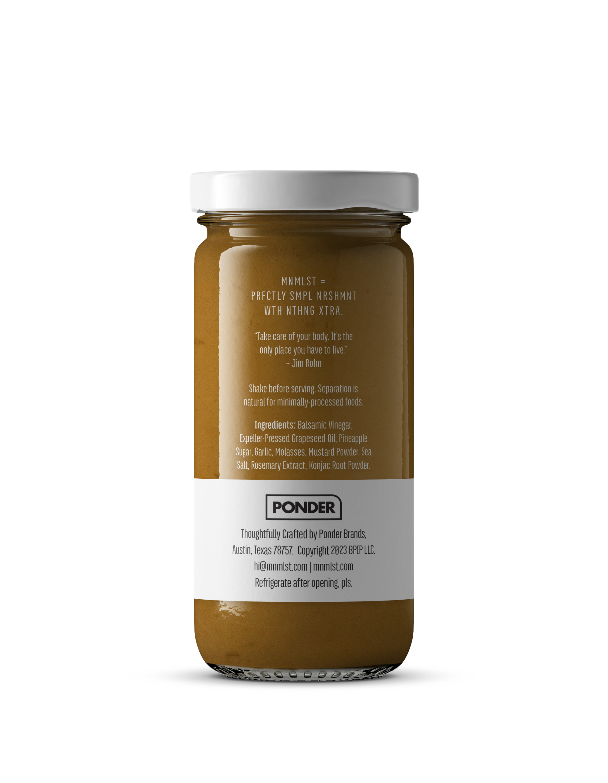 INGREDIENTS: Balsamic Vinegar, Expeller-Pressed Grapeseed Oil, Pineapple Sugar, Garlic, Molasses, Mustard Powder, Sea Salt, Rosemary Extract, Konjac Root Powder.