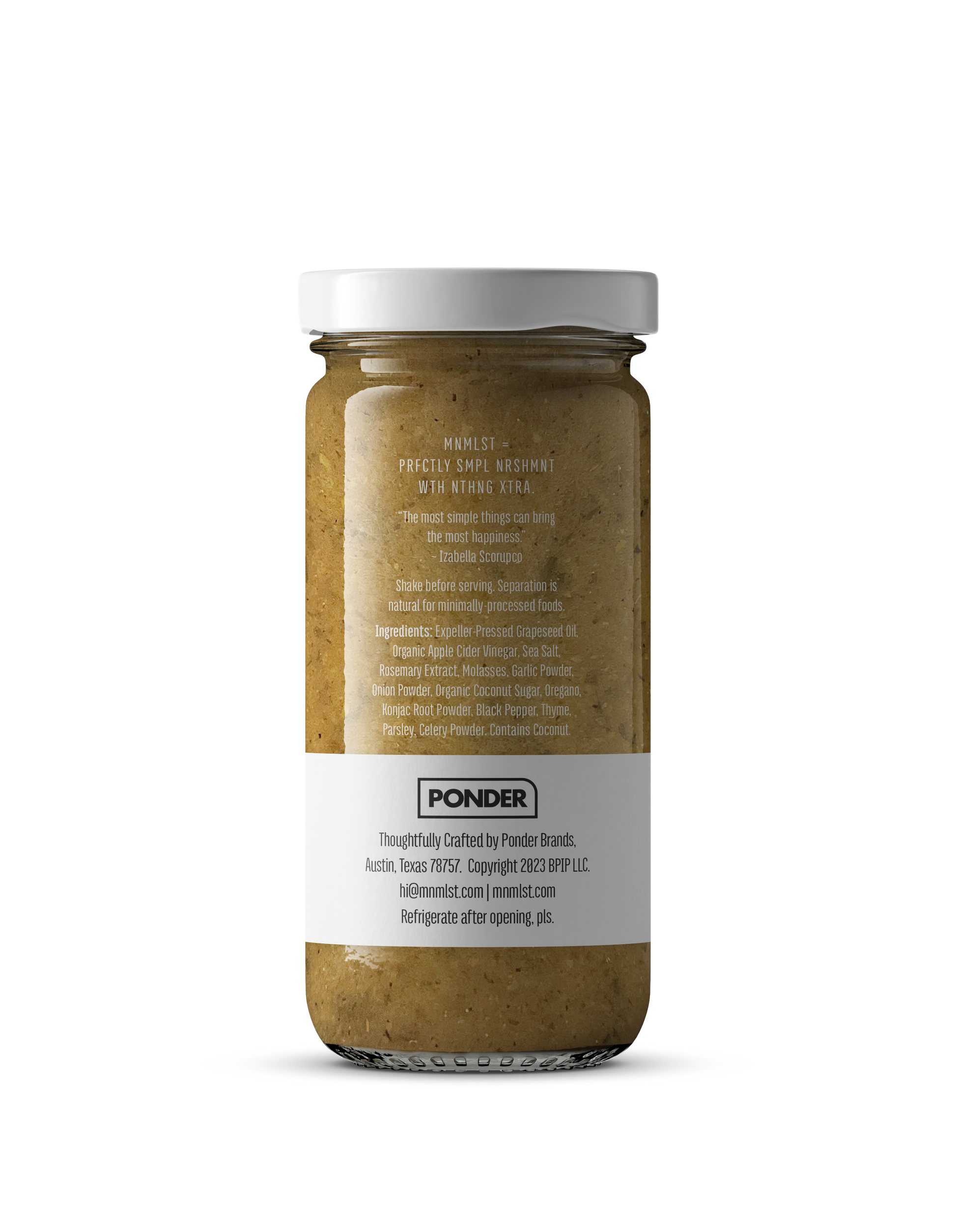 INGREDIENTS: Expeller-Pressed Grapeseed Oil, Organic Apple Cider Vinegar, Sea Salt, Rosemary Extract, Molasses, Garlic Powder, Onion Powder, Organic Coconut Sugar, Oregano, Konjac Root Powder, Black Pepper, Thyme, Parsley, Celery Powder. Contains Coconut.