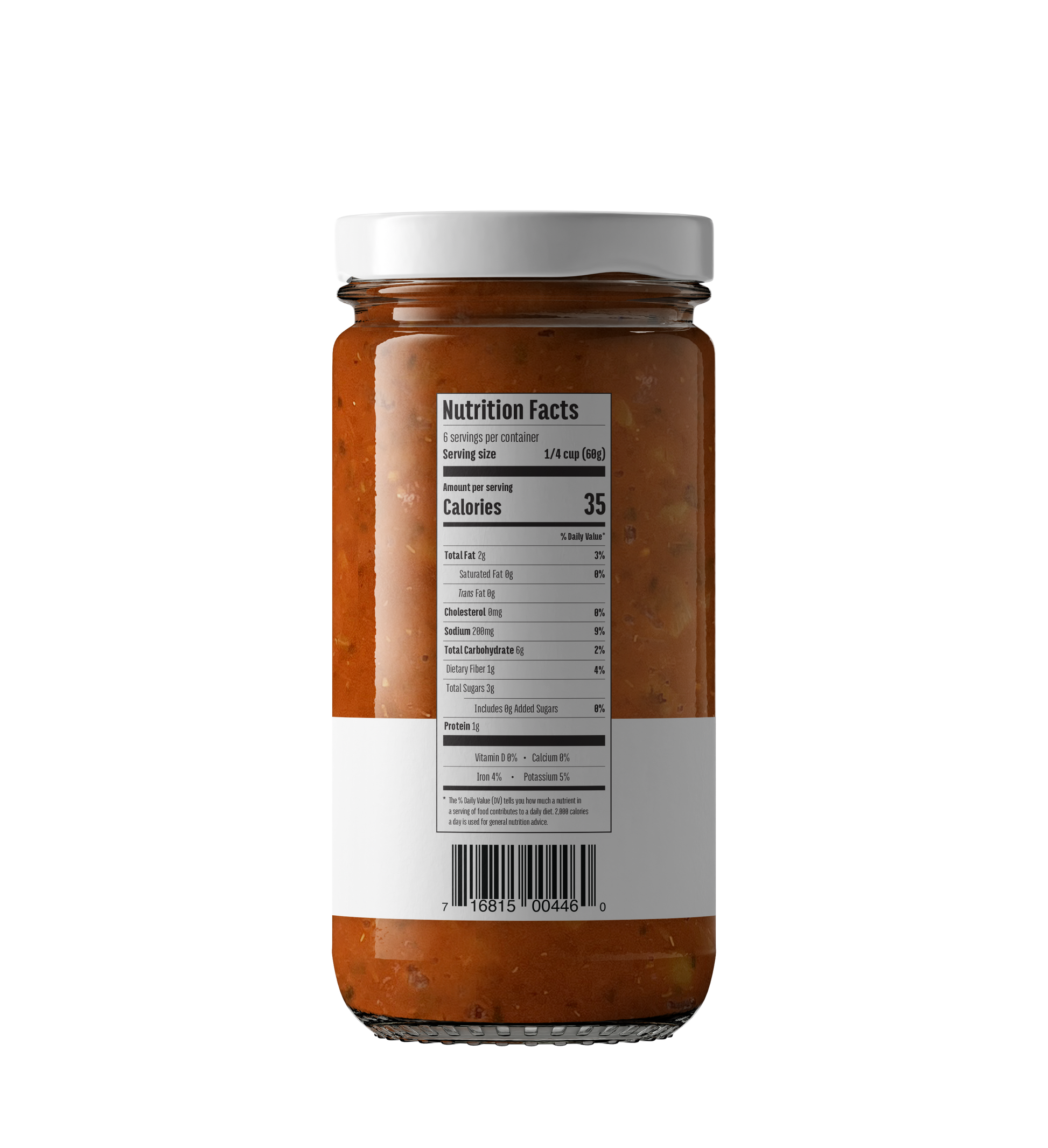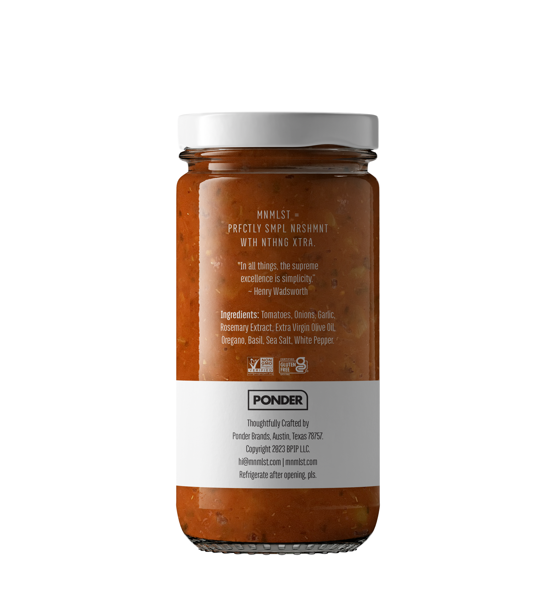 INGREDIENTS: Tomatoes, Onions, Garlic, Rosemary Extract, Extra Virgin Olive Oil, Oregano, Basil, Sea Salt, White Pepper.